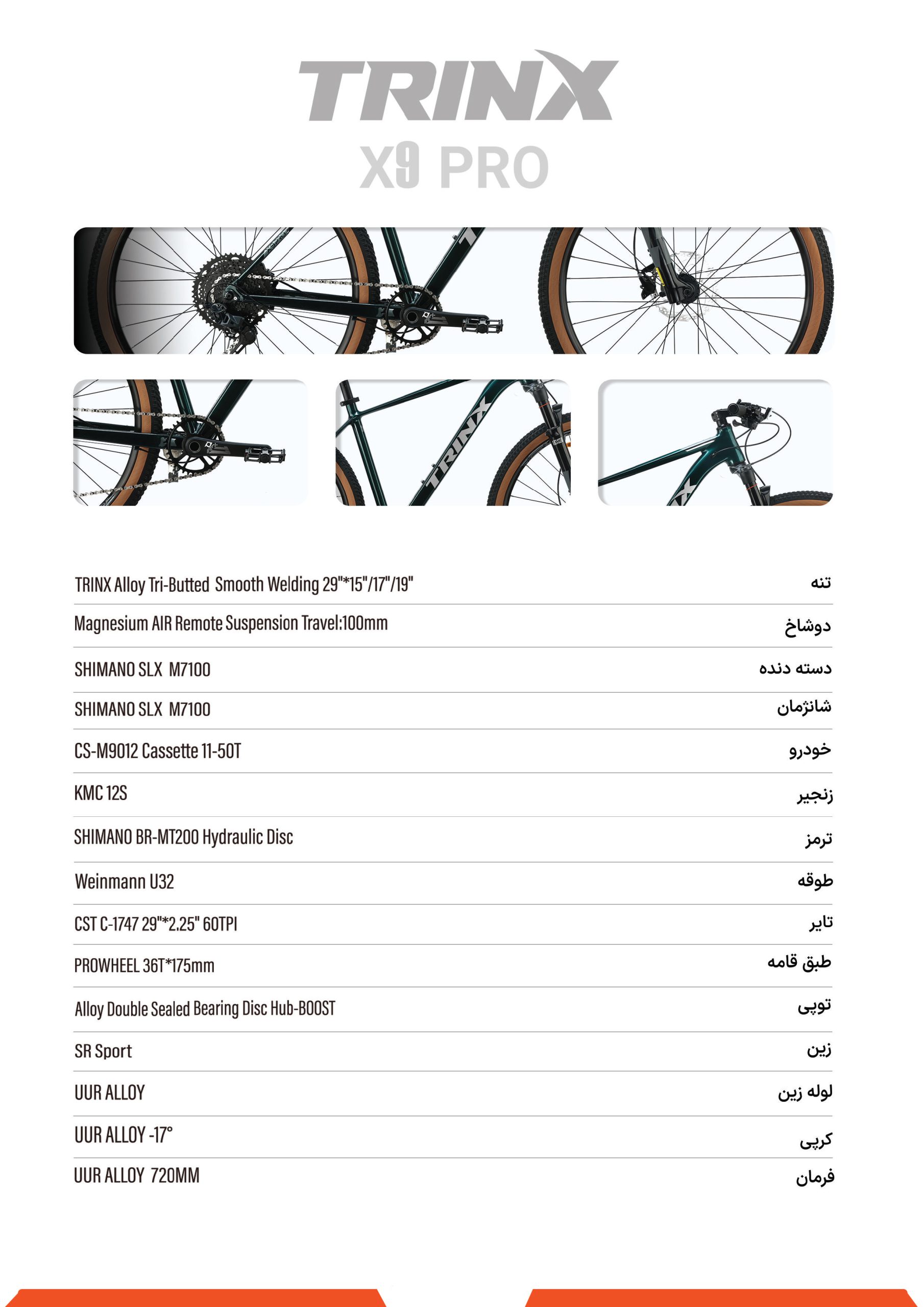 دوچرخه حرفه ای برند ترینکس TRINX مدل ایکس 9 پرو X9 PRO با بدنه آلومینیوم 6061 یکی از برندهای پرطرفدار در بازار ایران است که محصولات آن از کیفیت بالایی برخوردار بوده و قیمت بسیار مناسبی دارد. دوچرخه حرفه ای ترینکس مدل ایکس پرو X9 Pro سایز 29 با بدنه آلومینیوم 6061 و استفاده از قطعات بسیار با کیفیت و سیستم دنده پرچم دار شیمانو SHIMANO SLX، طراحی زیبا و رنگ های مختلف میتواند انتخاب مناسبی هم برای بانوان و هم آقایان باشد. فریم این دوچرخه مدیوم 17 Medium با توجه به سایز طوقه دوچرخه که 29 است مناسب افرادی با قد 170 سانتی متر تا 195 سانتی متر است. در فروشگاه مشهد دوچرخ کلیه دوچرخه ها به صورت مونتاژ شده ارسال می گردد. اگر قصد خرید دوچرخه حرفه ای و در عین حال فوق العاده باکیفیت را دارید دوچرخه ترینکس مدل ایکس 9 پرو X9 PRO با تنه آلومینیومی از جمله مدل هاییست که در بین دوچرخه سواران حرفه ای از محبوبیت بالایی برخوردار است.